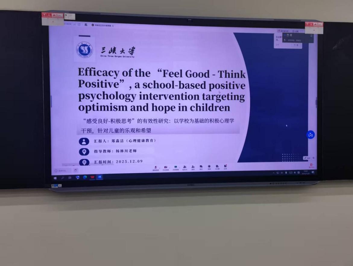 其次,郑淼洁同学进行了文献分享汇报,其汇报题目为《“感受良好-积极思考”的有效性研究:以学校为基础的积极心理学干预,针对儿童的乐观和希望》。