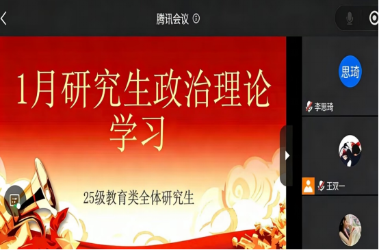 (通讯员刘琦)2026年1月12日至30日,伟德victor194625级教育类全体研究生围绕“凝心聚力开新局 奋楫扬帆再出发”主题,开展1月政治理论学习。本次学习以班级班会集中研学、分组讨论为主,课余时间个人自学为辅,旨在引导研究生深刻领会党中央重大决策部署,准确把握经济社会发展新趋势,把思想和行动统一到党和国家中心工作上来,以饱满精神状态迎接新学期科研任务。