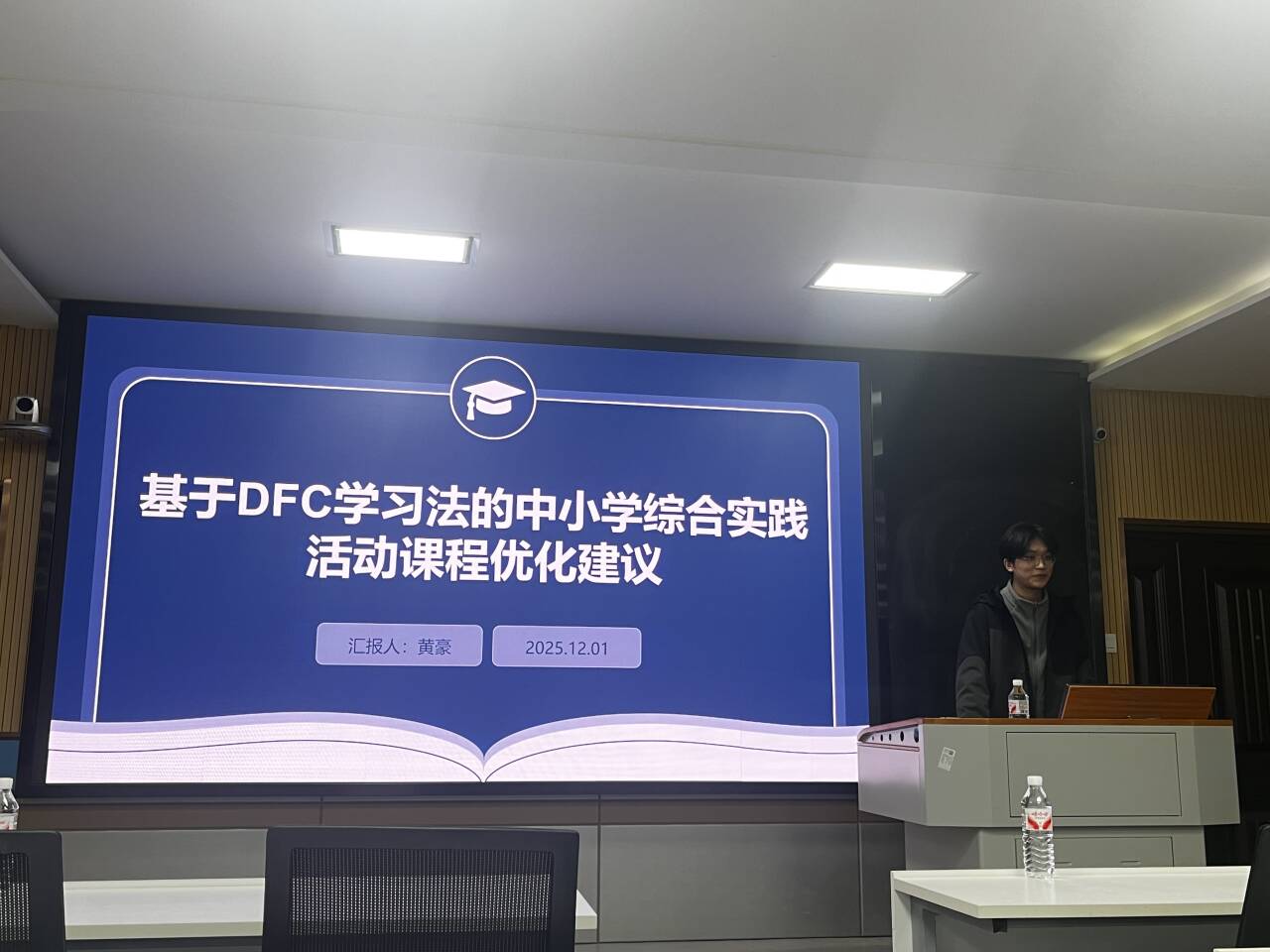 随后,黄豪同学以《基于DFC学习法的中小学综合实践活动课程优化建议》为题进行了专题汇报。报告指出,当前中小学综合实践活动课程存在定位边缘化、内容零散、实施浅显等问题。为解决这些困境,研究引入DFC学习法,围绕“感受、想象、实践、分享”四个阶段,提出系统优化路径:引导学生在真实情境中发现问题,鼓励创新构想,推进实践探究,并通过多元分享实现反思与评价。该建议强调以学生为中心,推动课程从形式化走向深度实践,为提升综合实践活动育人实效提供了可行思路。