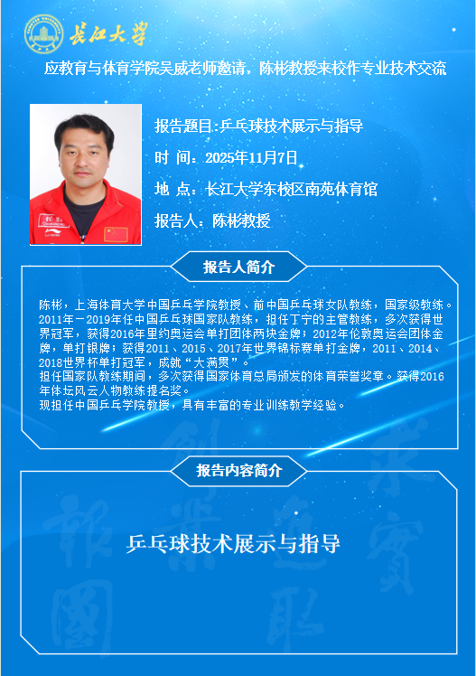 陈彬教授拥有丰富的国家队执教经验与深厚的理论功底,此次机会难得。欢迎广大师生踊跃参加,共同领略国球风采与顶尖教练
