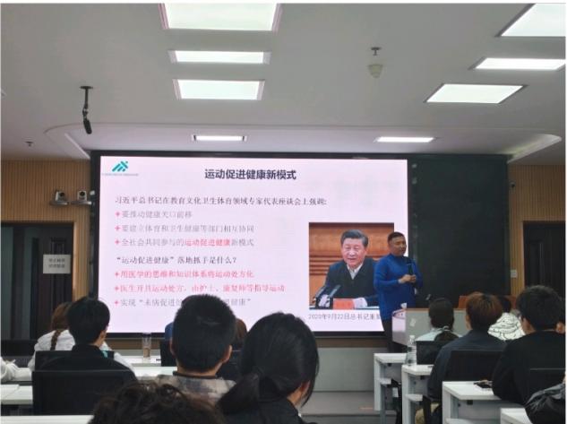随后,徐峻华院长正式开启专题报告。报告紧扣国家及地方体医融合相关政策,系统梳理了运动处方在健康管理、运动康复、体育康养等领域的应用现状与未来发展趋势。他以理论阐释结合实例剖析的形式,生动解读了运动处方在慢性病干预、术后功能恢复、特殊人群运动干预等场景的实践作用与应用价值,全面分享了体医融合领域的前沿进展与研究热点。整场报告内容详实、逻辑清晰、兼具专业性与实用性。现场师生全程认真聆听、细致记录,深入思考,充分展现出对运动处方研究与行业发展的浓厚学习热情。