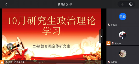 (通讯员 刘琦)2025年10月24日至27日,bv伟德国际1946全体博士、硕士研究生围绕“赓续红色血脉,勇担时代使命”主题,开展10月政治理论学习。本次学习以班级班会集中研学、分组讨论为主,课余时间个人自学为辅,旨在引导研究生把学习贯彻习近平新时代中国特色社会主义思想不断引向深入,把党的二十大精神转化为勇攀学术高峰、投身教育强国建设的强大动力。