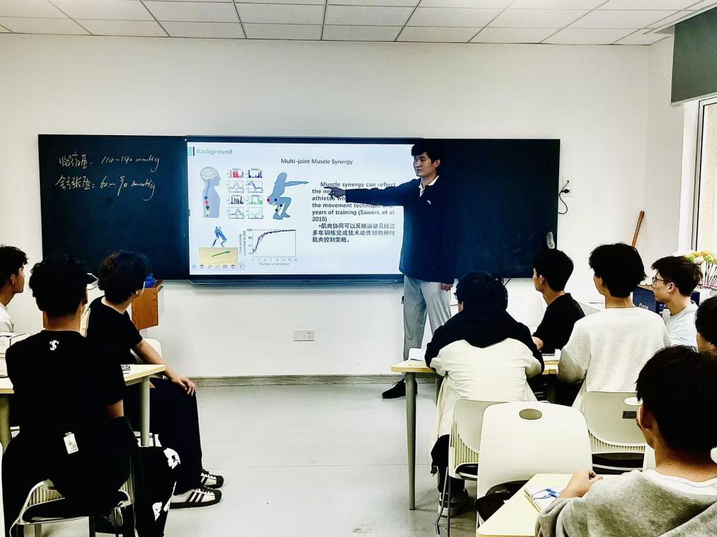 交流环节中,樊鹏磊博士围绕选题凝练、实验设计、数据处理和论文写作等问题与学生进行了讨论,鼓励研究生在掌握前沿方法的同时,始终围绕真实运动问题开展科研。现场学生认真聆听、积极交流,学术氛围良好。