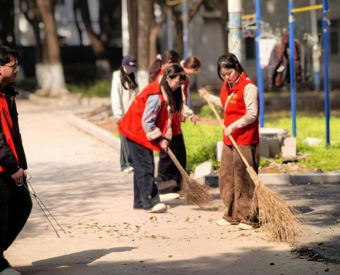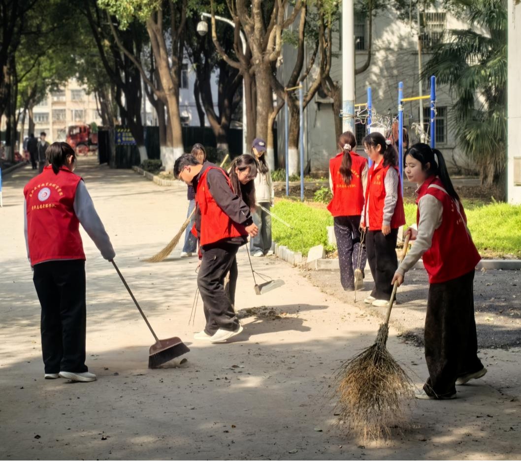 本次活动分为植树节起源、树木养护等知识讲解与劳动实践教育两个环节。活动现场,同学们分组协作、有序进行。大家身穿志愿者红马甲,手持扫把、火钳等清扫用具将南苑体育馆主干路上及片区的落叶扫入花坛中,为树木囤积堆肥,同时部分同学仔细将路面和花坛中的白色垃圾归类到垃圾桶,用实际行动维护了学校南苑片区的卫生环境。