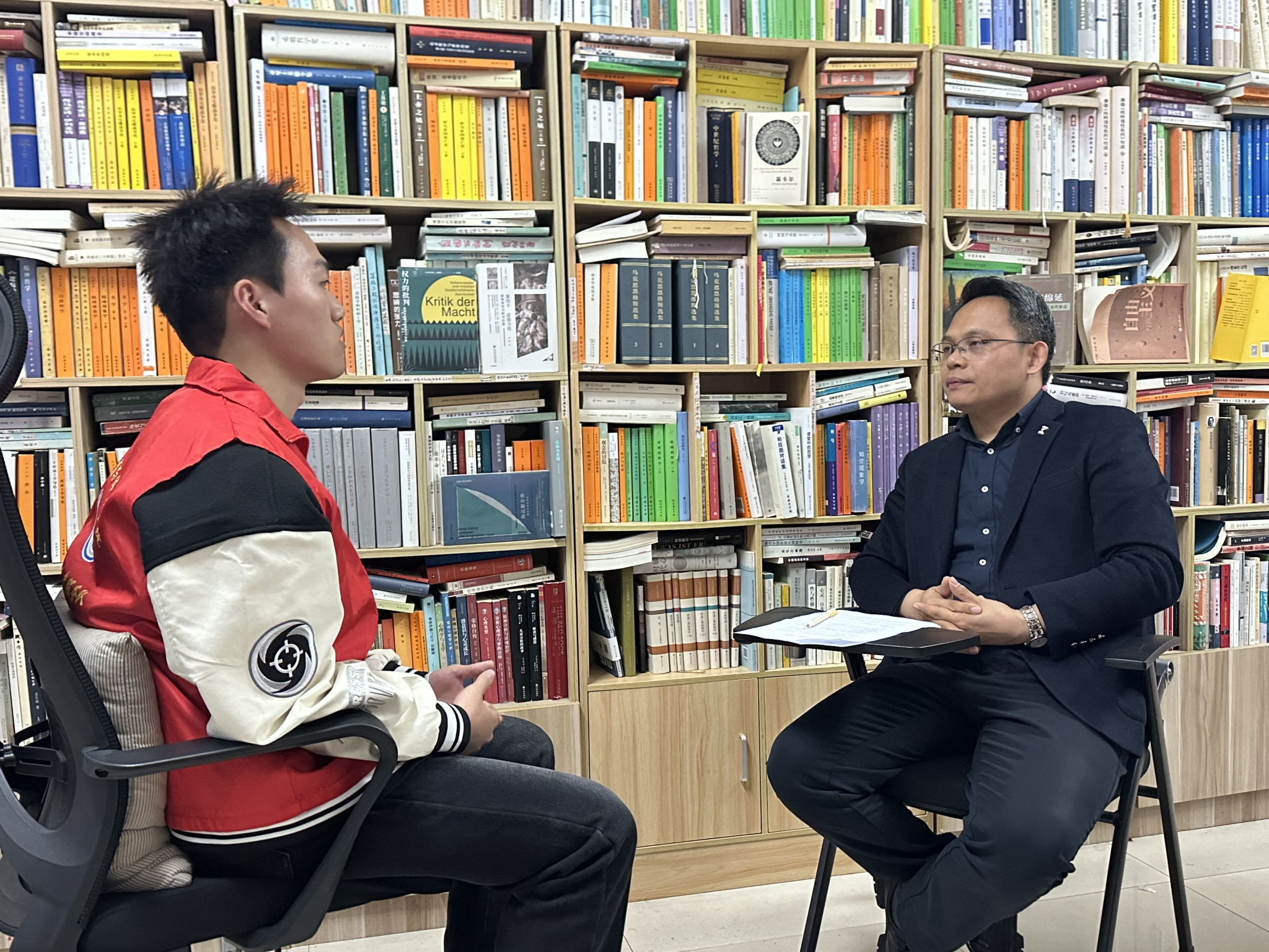 本次访谈聚焦于阅读习惯培养、碎片化时代的深度阅读策略、校园读书氛围构建及教师示范引领等核心议题展开交流。志愿者谢凯沥同周老师深度访谈过程中,周老师就个人如何培养阅读习惯、校园如何构建阅读文化给予了深入见解。