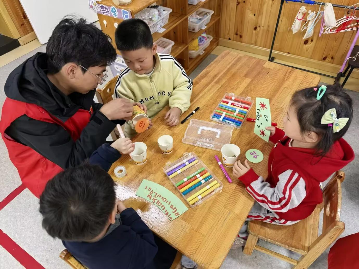 手工制作环节,志愿者从乱扔垃圾的危害切入,向孩子们展示利用废旧卡纸和纸杯制作的卡通垃圾桶及精美摆件,激发了他们的浓厚兴趣。现场,孩子们积极动手参与,精心剪贴卡纸、细致绘画装饰,为纸杯"穿上"富有创意的卡通外衣。志愿者们默契分工协作,耐心细致地指导裁剪粘贴技巧,助力孩子们将奇思妙想转化为精美作品。原本废弃的材料在孩子们手中蜕变成造型各异的垃圾桶和收纳盒,在充满童趣的创作过程中,生动传递了"变废为宝"的环保理念。