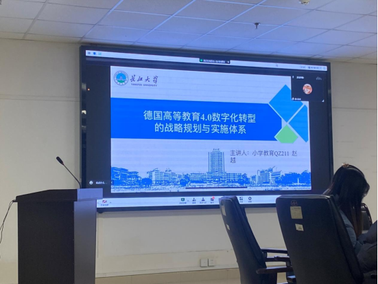 赵越同学就“德国高等教育4.0数字化转型的战略规划与实施体系”进行了专题报告。她首先阐述了德国高等教育数字化转型的研究背景,说明了研究意义。其次从推行高校数字转型政策、提升高校师生数字素养、优化高校基础设施建设、保障高校信息数据安全和构建数字高教国际格局五个方面分析了战略规划,并从教学、课程、研究、行政管理四个方面阐明了实施体系。最后,赵越同学论述了德国高等教育数字化转型对我国高校改革带来的启示。
