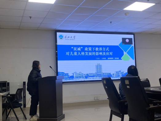 加倩倩同学,她就“‘双减’政策下教养方式对儿童人格发展的影响及应对”进行了专题报告。她首先说明了研究的背景,其次介绍了教养方式的含义及类型,分析了四种教养方式对儿童的影响,并论述了“双减”政策下养成正确教养方式的方法。汇报的最后加倩倩同学阐明了本次研究的不足之处。