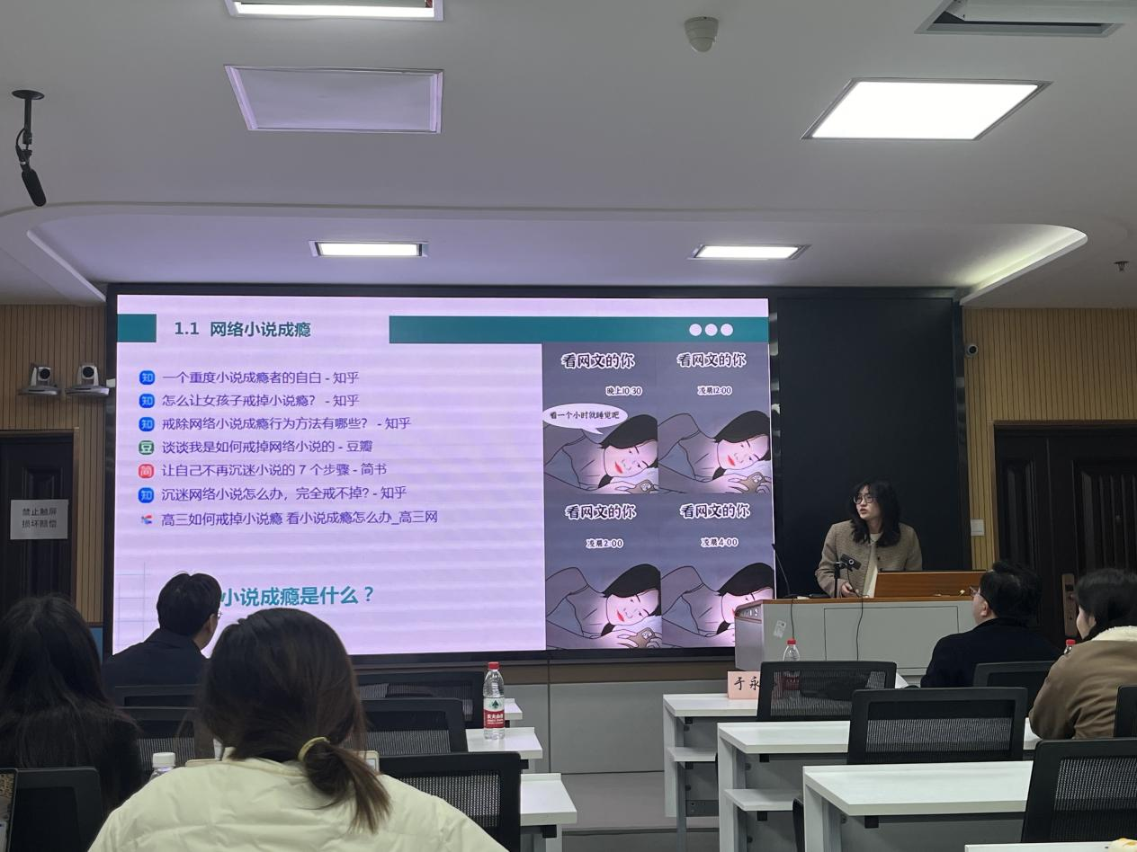 随后,程丽媛针对网络小说成瘾与抑郁的关系展开全面透彻的思考,并提出疲惫感在二者关系中的中介作用以及心理僵化的调节作用,选题新颖,最后号召大家避免网络成瘾,发人深思。