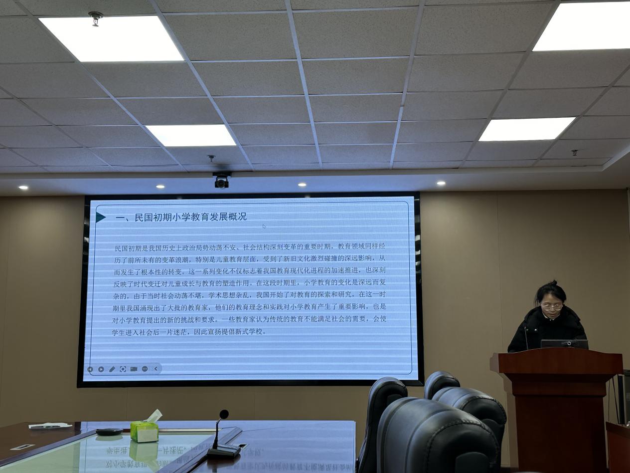 王超冉汇报的主题是《民国初期私塾与新式小学学校教育的比较研究》,她以民国初期小学教育发展概况为研究背景,表明当时的教育家提倡建立新式学校,并从民国政策、教育思想、社会发展变革等方面出发,呈现出人们对教育的重视程度有所提升的变化趋势,启示着我们更系统更全面的看待现代教育,提出更为有效的举措继续发展现代教育。
