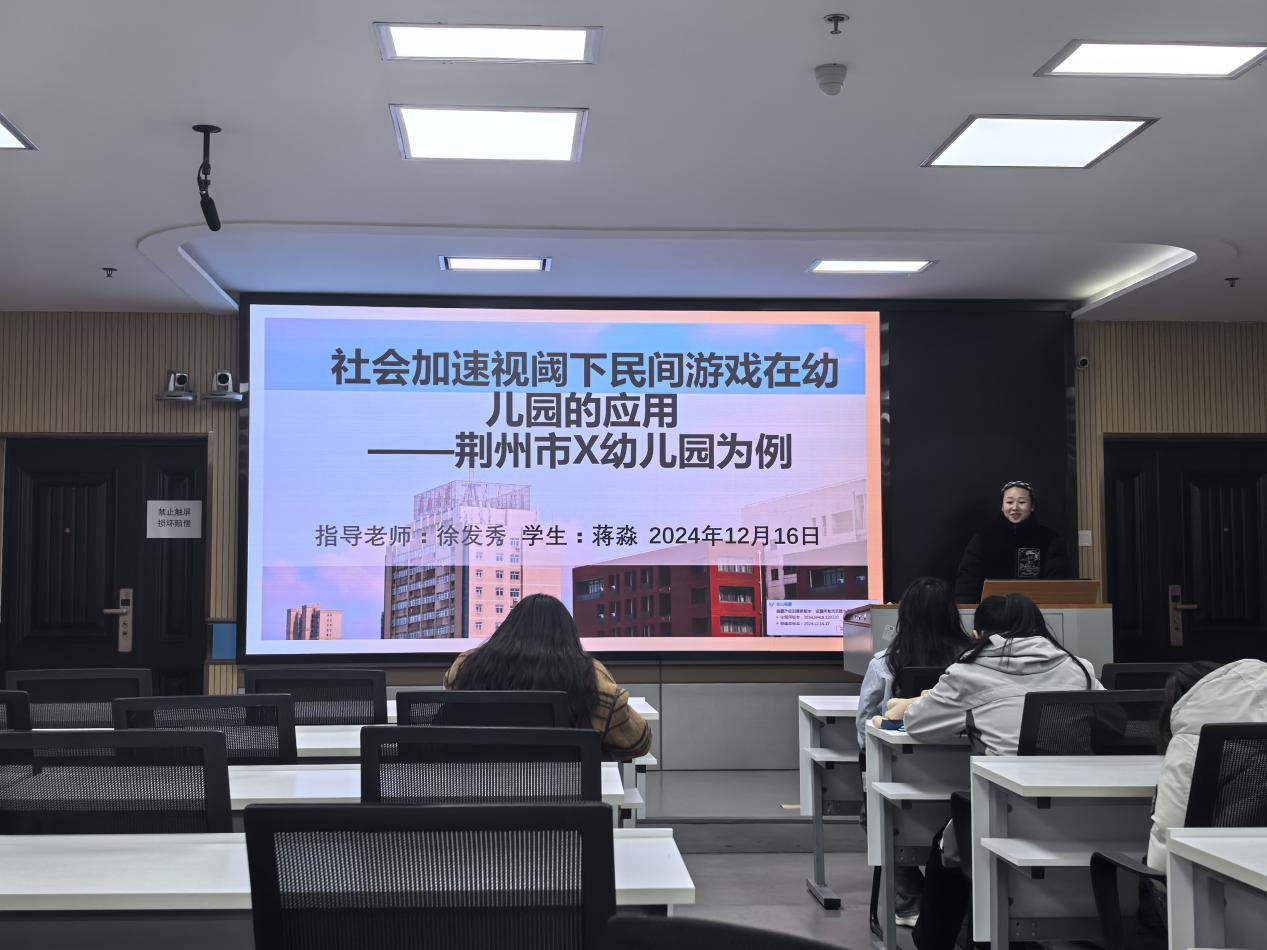 首先进行汇报的是蒋淼,她汇报的主题是《社会加速视阈下民间游戏在幼儿园的应用》,她运用社会加速理论引出论点,并指出随着科技和经济的不断发展,“竞争”已经成为主要的社会准则,因而在幼儿园教育中,竞争逻辑也渗透其中,在这种竞争背景下,民间游戏在幼儿园中应用就会伴随着一些问题,结合调查案例,她提出了问题产生的原因和解决措施。